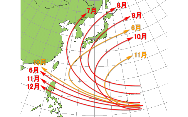 台風の通る進路は月が進むにつれて南へ下がっていくようです。