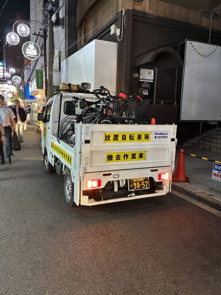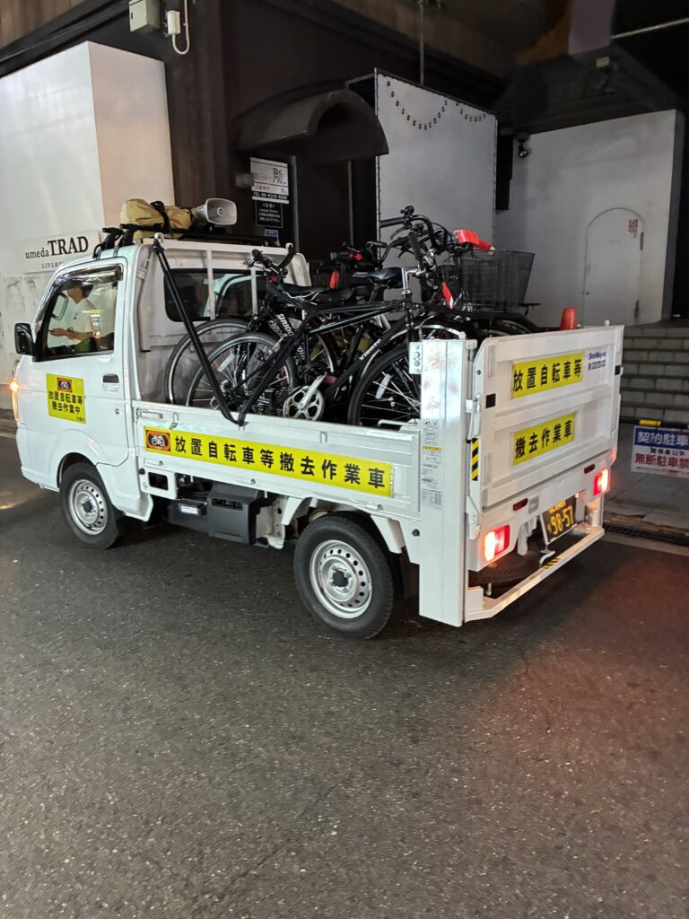 今まで日中のみの撤去でしたが、万博などで増加する観光客や通行人に安全で快適な環境を提供するため、夕方から夜間にかけて毎日、梅田やミナミなどの繁華街で放置自転車の撤去を行っています。