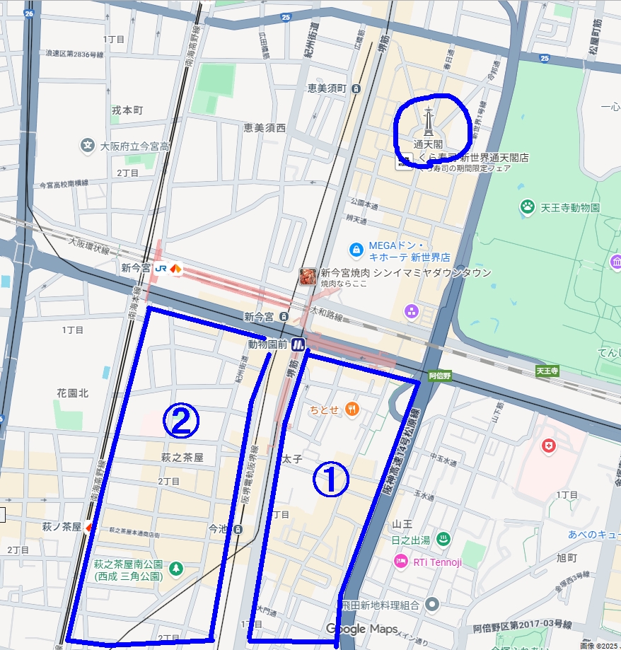 下の地図で言う①の太子町、②の萩之茶屋あたりはかなりのディープゾーンなのであります。